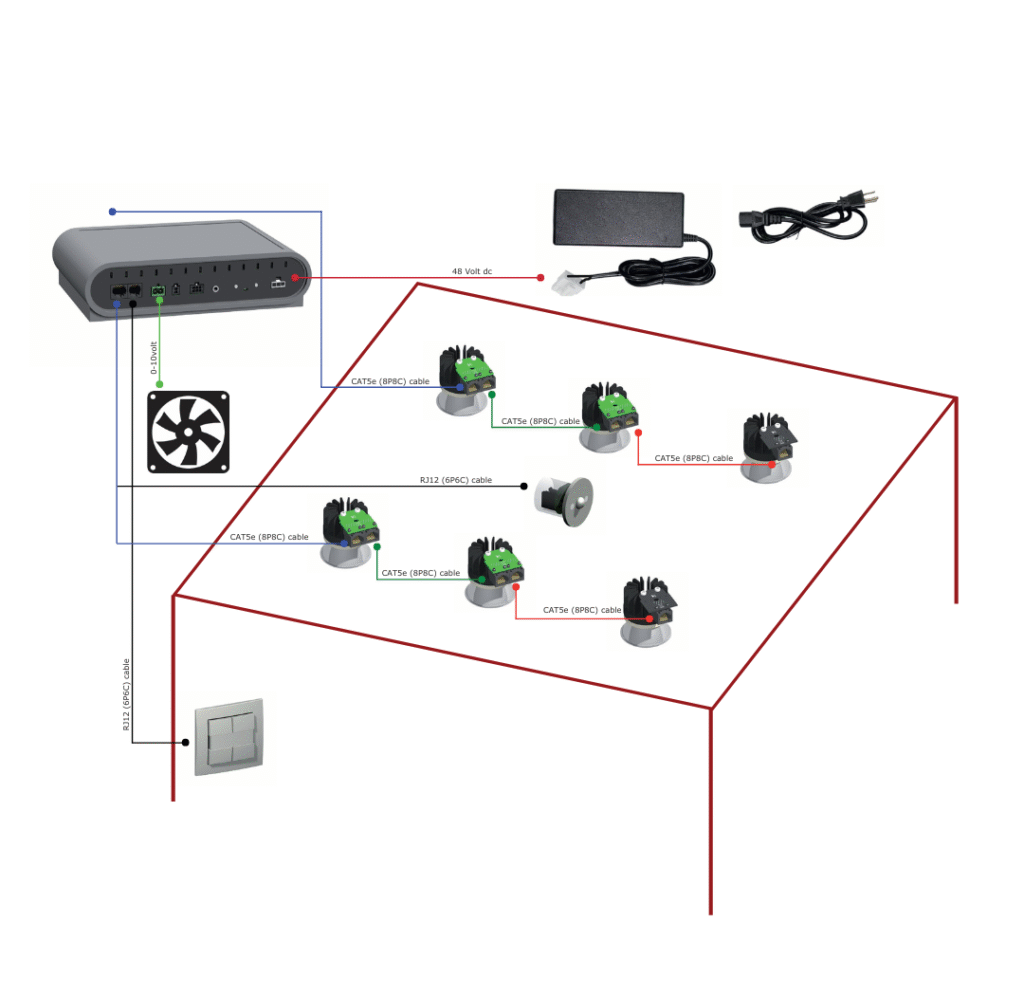 Met de kleurgecodeerde Cat5-kabels installeer je foutloos zonder knippen of strippen. De drivers en voedingen zijn centraal geplaatst in de technische ruimte, waardoor onderhoud veel sneller en eenvoudiger uit te voeren is. Lichtbronnen klik je direct in vrijwel elk armatuur. Alles wordt per project en per ruimte geleverd in overzichtelijke kratten.